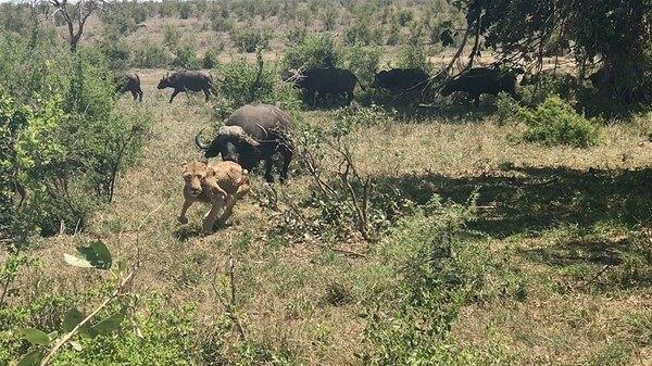 Bufalo sürüsüyle karşılaşan aslan bir anda beklenmedik bir saldırı ile karşılaştı.