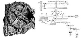 Bu resimde Antikythera makanizmasını görmektesiniz. Sağ tarafta ise teknik şeması yer almaktadır. 1900 yılında Girit adasında bulunmuştur. M.Ö. 1.yüzyıla tarihlenmektedir. Bu antik bronz mekanizma bize eski uygarlıkların düşündüğümüzün aksine daha ileri bir teknik bilgiye sahip olduğunu kanıtlıyor. Astronomik takvim olduğu düşünülen bu mekanizmada (ya da bir makinanın parçası) içinde başka dişlilerde bulunmaktadır.