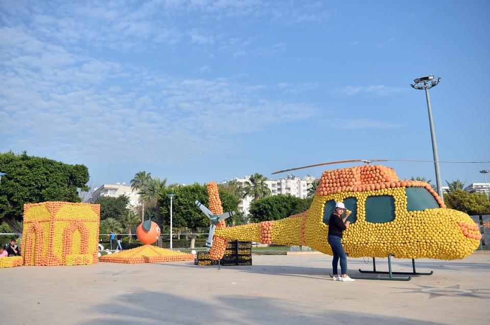 Evlerini geçindirmek için ek gelir elde etmeye çalışan kadın işçiler, bir haftadır süren hazırlıklar kapsamında binlerce narenciye ürününü birleştirerek, helikopter, araba, motosiklet, gemi, ahtapot, semazen, kule gibi yapımı zor figürler oluşturuyor.