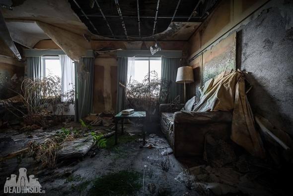 Ufalanmış tavanlar şimdi çürüyen katın üzerine yayılmış.