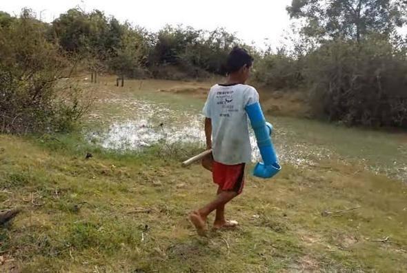 Çocuklar nehre girip balıkları korkutarak boruya yöneltiyor.