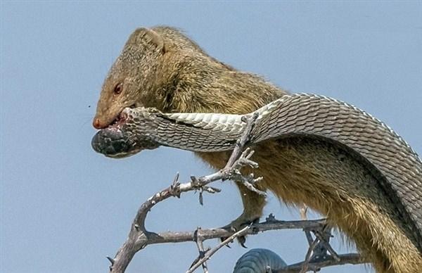 Boomslang yılanı ve gelincik arasındaki mücadele görenleri hayrete düşürdü.