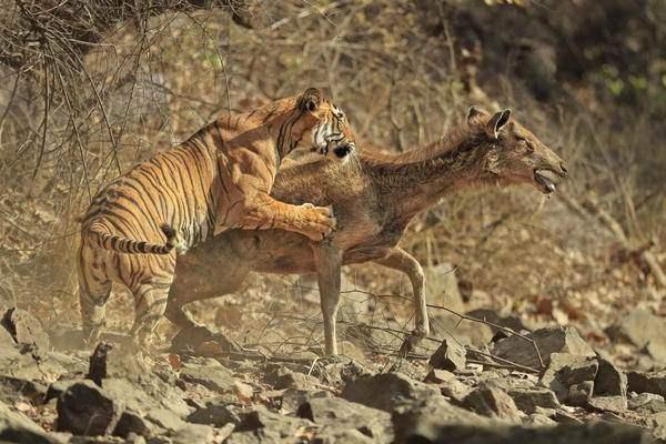 Sessiz ama hızlıca yaklaşan kaplan, avına bir anda saldırıyor ve işte ortaya bu görüntüler çıkıyor.
