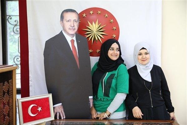 Halk Eğitim Merkezi'ndeki bakırdan el işleme ürünlerin yapılışını inceleyen Arap turistler, Cumhurbaşkanı Erdoğan'ın portresi ile fotoğraf çektiriyor.