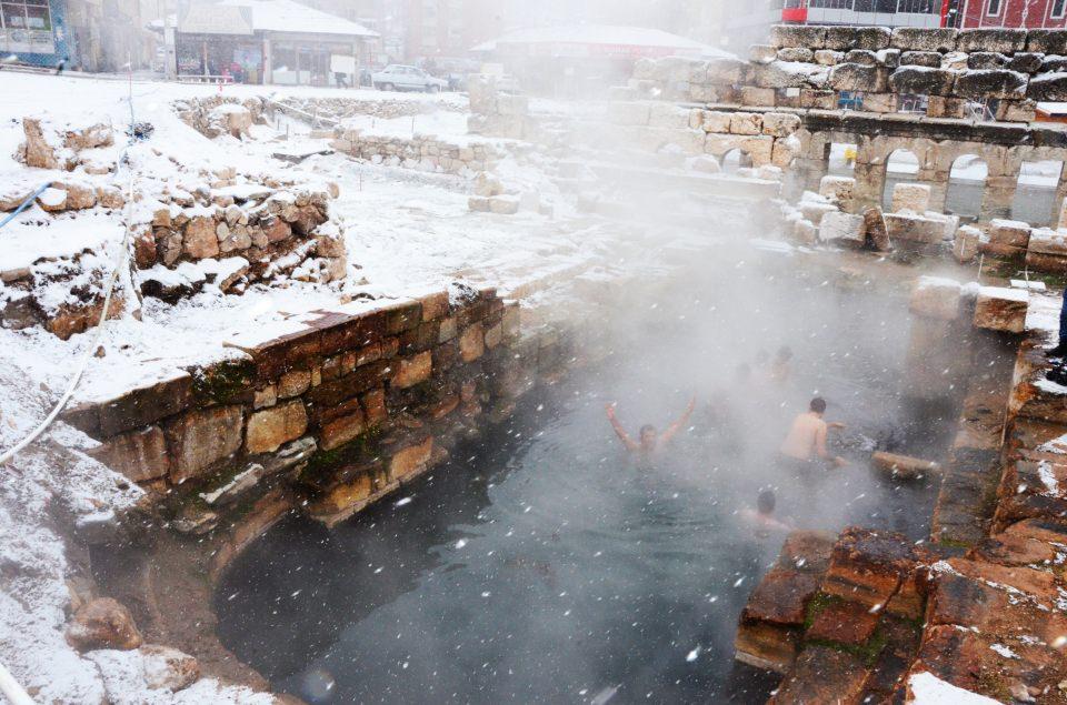 Hamam ve antik havuzun tanıtımına katkı sağlamak isteyen bir grup ilçe sakini, kar yağarken sıfırın altında 6 derecede havuza girdi.