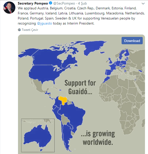 ABD Dışişleri Bakanı Mike Pompeo, Guaido'yu resmen Devlet Başkanı olarak tanıyan ülkelerin gösterildiği bir paylaşımı sosyal medya hesabı üzerinden yayınladı. Paylaşımda darbeye sahip çıkan ülkeler mavi olarak gösterilirken, henüz tanımayanlar da renksiz olarak işaretlendi.