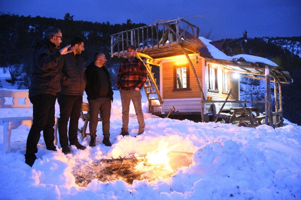 "Bu karavanı 45 günde imal edip 4 çeker aracıma bağlayarak 2 bin 100 rakıma çıkardım. Getirebileceğim en yüksek noktaya getirdim. 18 metrekare genişliğinde ve yüksekliğini 2 metre insan boyuna göre tasarladım. İçerisinde soba yakarak ısınıyoruz. Banyo, tuvalet, mutfak, yatak yerleri gibi her şeyi düşünerek tasarladım. Elektrik ihtiyacını kurduğumuz güneş enerjisi sistemiyle karşılıyorum. Alt kısmına makaslar yerleştirdim. O nedenle yüksek eğimli arazilere de çıkabiliyor."