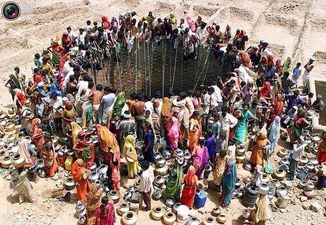 Bu fotoğraf Hindistan'ın batısından, Natwarghad köyünden. Kuyunun etrafında toplanan insanlar, temiz su alabilmek için çabalıyor. (2003)