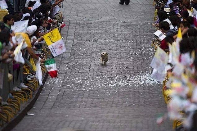 Meksika'da Papa halkı selamlarken peşine takılan bir köpek keyifle alanı izliyor. (2011)