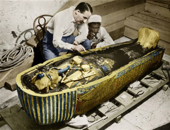 Arkeolog Howard Carter, 1923 yılında mezarı açılan Tutankhamun'un altından lahitini incelerken.