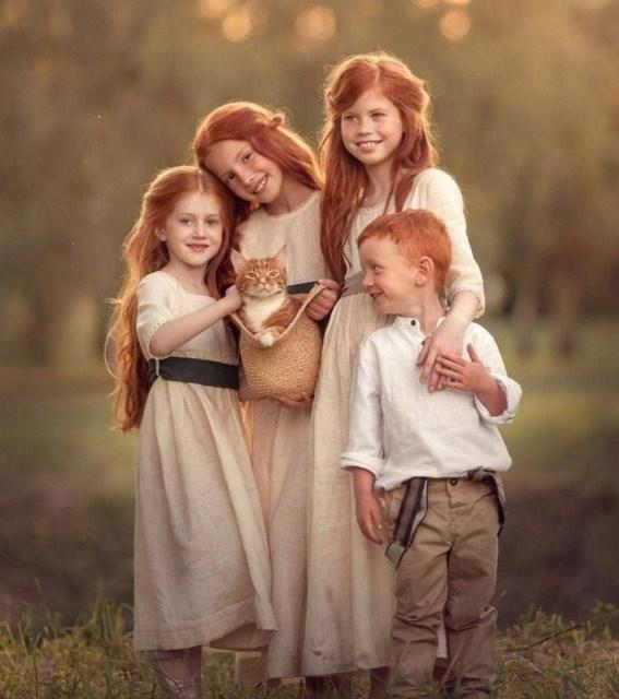 Kızıl saçları ile gülümseten sevimli kardeşler.