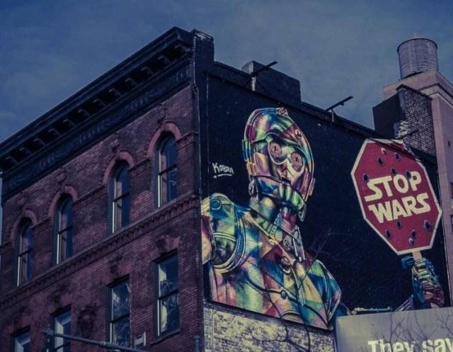 'Savaşa hayır' sloganı ile poz veren C-3PO.