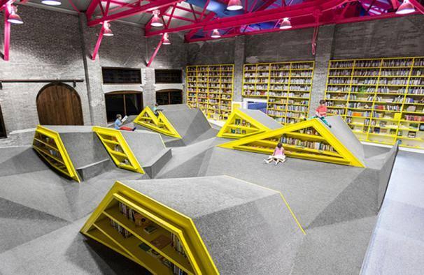 Baş aşağı hissi uyandıran kitap rafları ve oturma tasarımları ziyaretçilerin zaman kavramını unutup rahatlayarak okumaya teşvik ediyor. Deniz köpüğü mavisi rengindeki duvarlardan yansıtılan ışıklandırma ile okuma alanları sıcak ve konforlu bir alan hissi oluşturuyor.