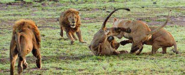 Sürünün diğer erkek aslanları da yardıma gelince yabancı aslan çareyi kaçmakta buldu.