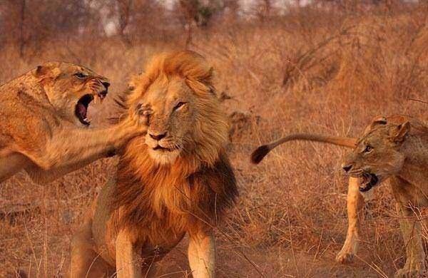 Sert pençe darbeleri ve ısırıklarla şaşkına dönen erkek aslan, iki dişi aslanın karşısında çareyi kaçmakta buldu.