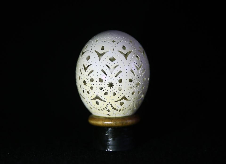 Zamanla sanatını geliştiren Eroğlu, bıldırcın yumurtaları üzerinde çalışmaya başlarken, kimi oyulmuş tavuk yumurtalarının içini de tela ile kaplayarak daha estetik bir görünüm kazandırıyor.