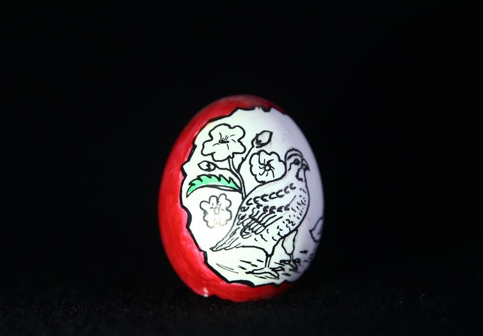 Yumurtanın bir kaideye oturması ve oyulması içini boşalttığını anlatan Eroğlu, bir hafta devam eden oyma sonrası daha fazla zevk almak için zor olanı seçip uygun gördüğü eserlerin içine cımbız kullanarak tela yerleştirdiğini aktardı.