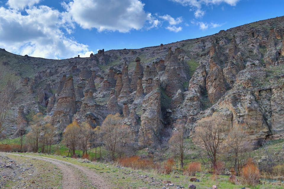 Vadide yer alan 150'ye yakın peribacasının, tortul kayaların su ve rüzgar erozyonuna uğraması sonucu oluştuğunu anlatan Ayhan, bu yapıların yoğun olarak Orta ilçesi Sakaeli köyüne 6 kilometre uzaklıktaki Gelin Kayaları bölgesinde bulunduğunu belirtti.