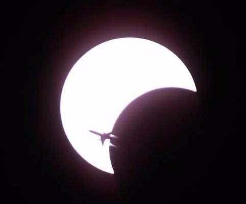 15 Ocak 2010 tarihinde meydana gelen ve 11 dakika 7.8 saniye süren bu güneş tutulmasında, ay, dünya ile güneş arasından geçerken o sırada geçmekte olan bir yolcu uçağının silüeti görülüyor. Fotoğraf Bangkok Tayland'da çekilmiştir.