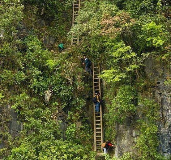 Okul çağındaki çocuklar Güney Çin'deki Zhang Jiawan köyünde okula ulaşmak için ne kadar güvenli olduğu belirsiz tahta merdivenleri kullanırken.
