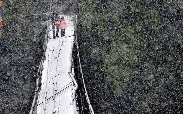 Çin'in Sichuan bölgesinde karlı havaya rağmen okula gitmek için kırık köprüyü geçen öğrenciler. (Dujiangyan)