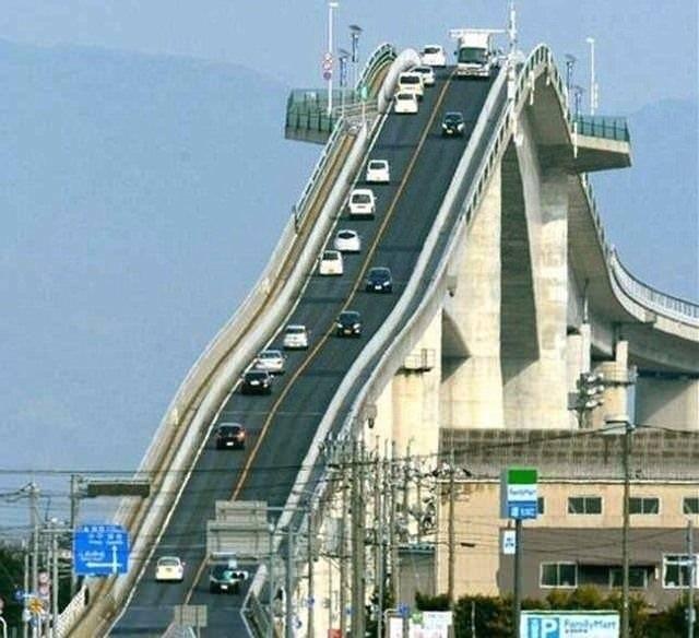 Normal şartlarda 'yol' denilen kavram, 'üzerinde güvenli bir şekilde yolculuk yapılan düzlem' olarak tanımlanabilir. Fakat Japon mühendisler, olayı 'biraz' yanlış anlamış olacak ki Dünya'nın en sürreal köprüsüne imza atmışlar.