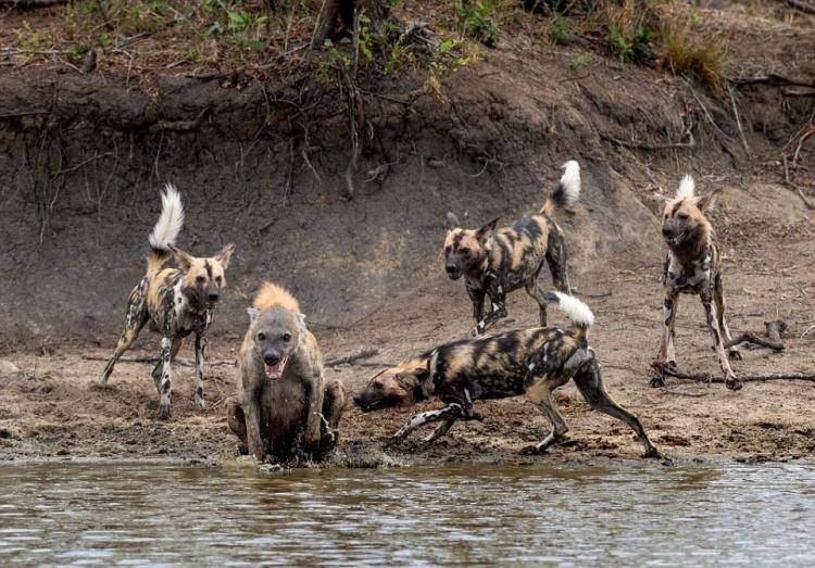 Sırtlan suya girerek köpeklerden kurtulmaya çalıştı.