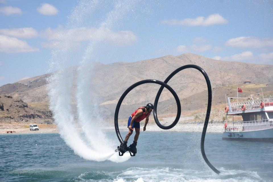 Dünya flyboard üçüncüsü Ali Komşusu, hem denizde hem de havada yaptığı estetik ve akrobatik gösterilerle izleyenlerin büyük beğenisini kazanıyor.