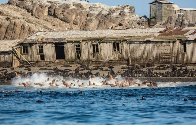 Kuril Adaları içinde, terkedilmiş Tulenyi Adası kıyısında bir mühür kolon