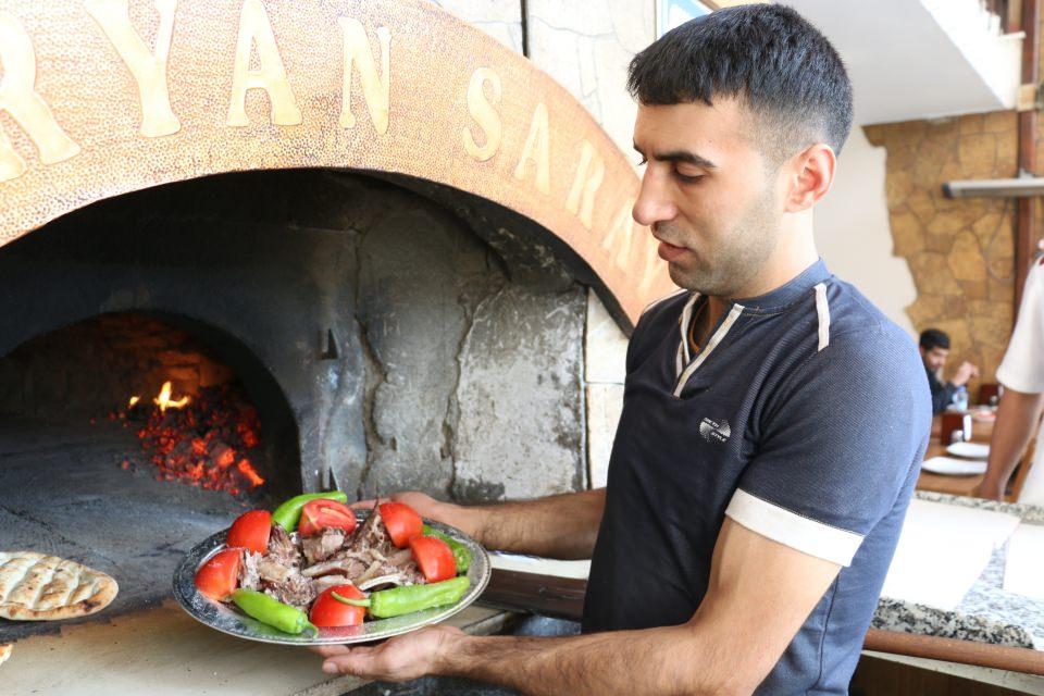 Büryanı müşterilere farklı lezzetlerle sunmaya çalıştıklarını dile getiren Kayaalp, "Büryan lezzetini tavayla birleştirdik. Yeni ama ilgi çeken bir lezzet oldu. Servise hazır hale gelen büryan kebabını tezgahta kaburga, omurga ve göğüs kısmı olarak ayırdıktan sonra bakır tavalara bırakıyoruz. Tavaya domates ve biberleri de ekledikten sonra taş fırında pişiriyoruz. Domates ve biberler közleniyor. Bu şekilde büryan tavayı müşterilerimize sunuyoruz." ifadelerini kullandı.