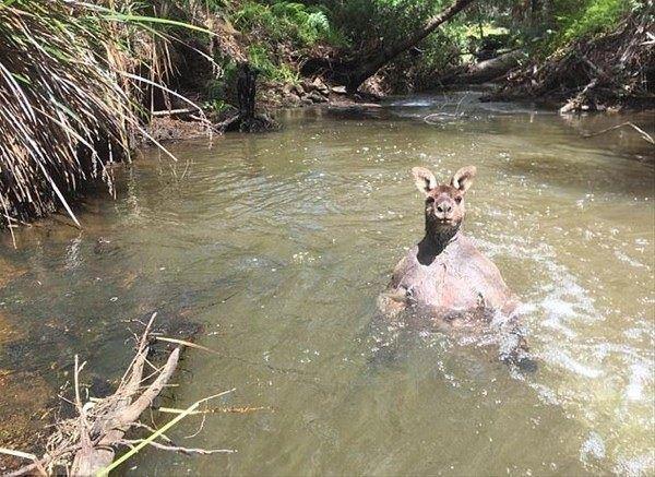 Kasları ve iri vücuduyla dikkat çeken kanguru, kendini güvende hissedene kadar suyun içinde kaldı.