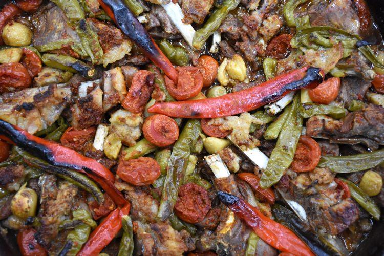Fırın ağzımızı yaparken altına kuyruk yağı kullanıyoruz. Sonra azar azar domates, biber ve soğan koyup üzerine eti yerleştiriyoruz. İçerisinde kuzunun but bölümünden kuşbaşı ve pirzola ile kuzu kaburga var.