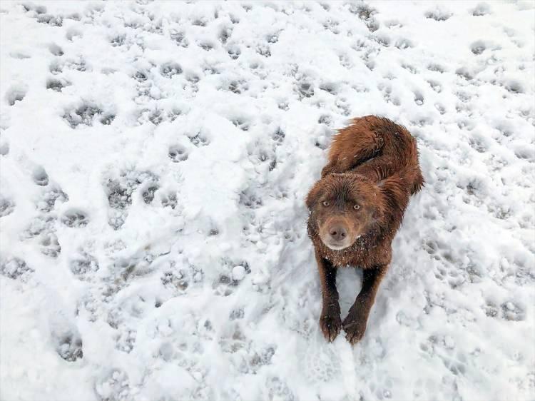 Kar üzerindeki köpek güzel görüntüler oluşturdu.