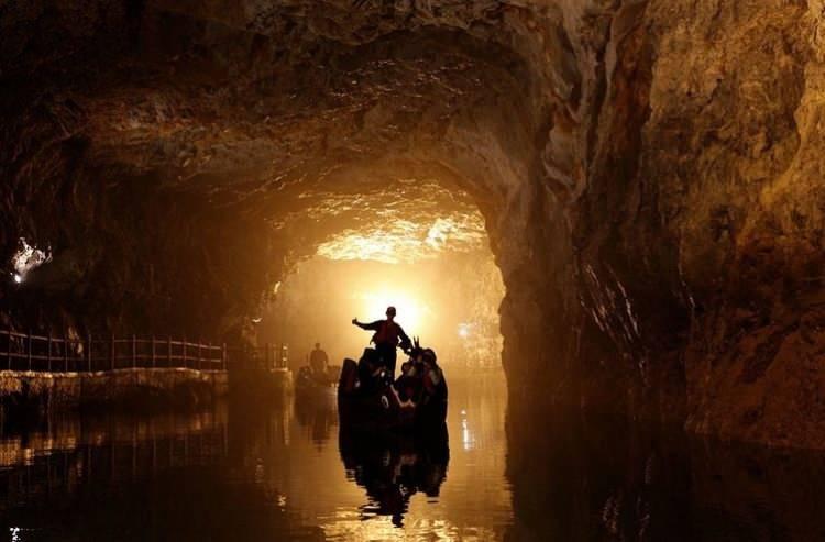 Kuzey Tayvan'da bulunan su tünelinde geleneksel bir botla gezen turistler.