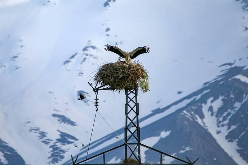 Elektrik direklerini mesken tutan leylekler, gün içinde doğadan topladıklarıyla yuvalarını tamamlamaya çalışıyor.