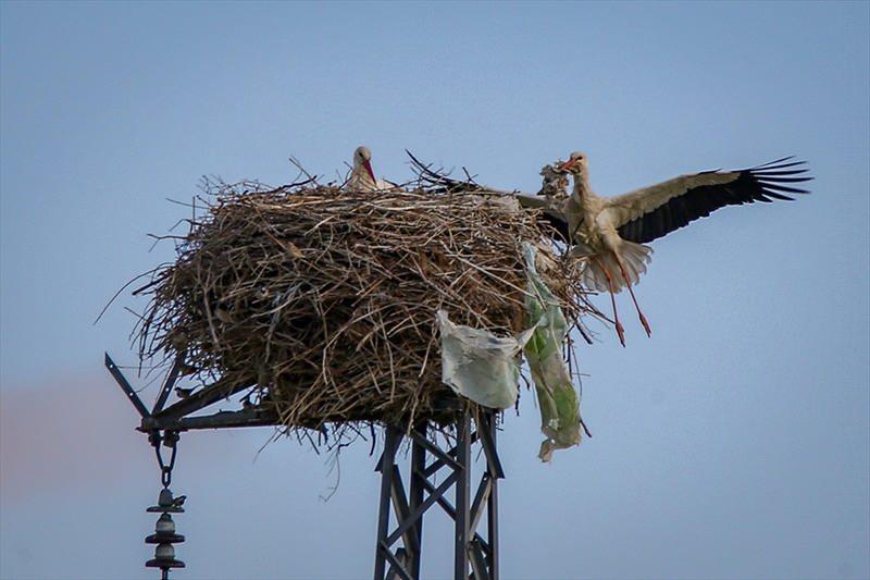 Leyleklerin yuva telaşı, Artos Dağı'nın karlı doruklarıyla güzel görüntüler oluşturuyor.