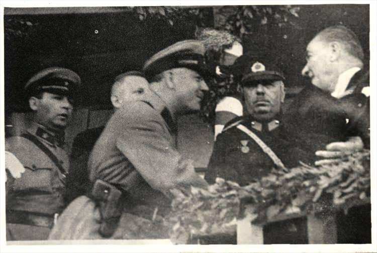 Atatürk'ün Cumhuriyet'in ilanının 10. yıl dönümü dolayısıyla düzenlenen törene katılan Sovyet Heyeti Başkanı Mareşal Kliment Yefromoviç Voroşilov ile çekilen fotoğrafı
