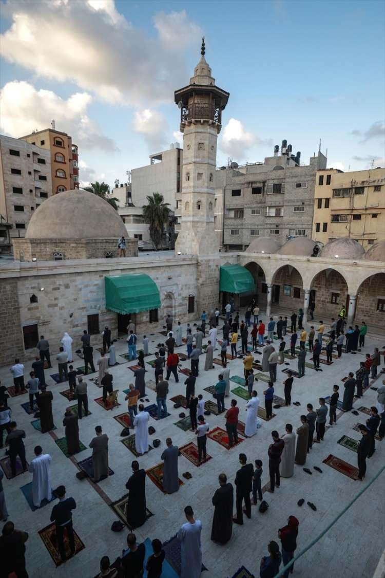Gazze Şeridi'nde, yeni tip koronavirüs (Kovid-19) nedeniyle yaklaşık 2 aydır ibadete kapalı olan camiler, alınan tedbirler çerçevesinde Ramazan Bayramı namazını kıldı. Müslümanlar, yanlarında getirdikleri seccadeleri Gazze kentindeki Seyyid Haşim Camii avlusunda yere sererek, bayram namazını eda etti.