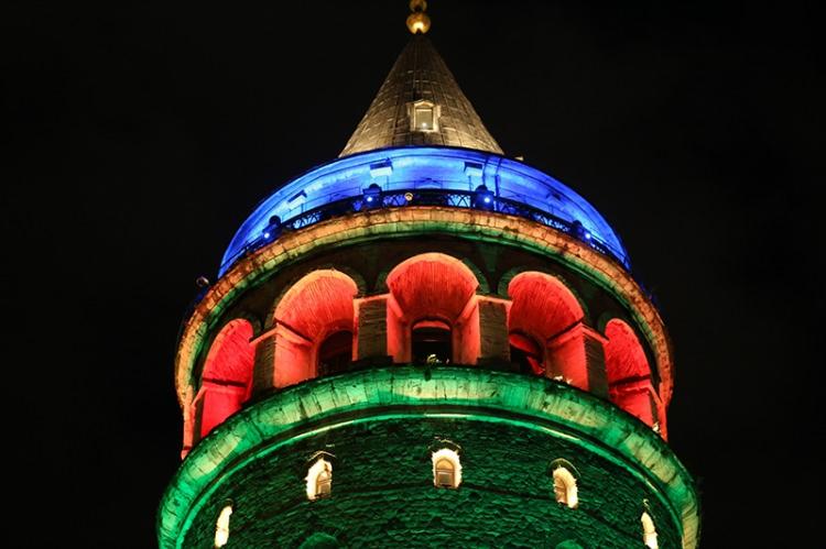 İstanbul'un simgeleri Azerbaycan bayrağı renklerine büründü