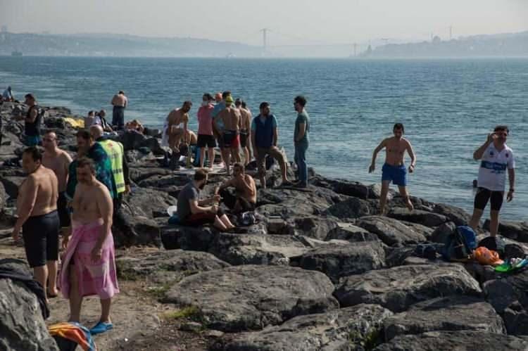 Fatih Sarayburnu'nda yıllardır yaz kış demeden denize giren 'Sarayburnu Fatihleri' normalleşme dönemine geçişin ardından iki buçuk ay sonra denizle buluştu. Yaklaşık 150 kişilik bir gruptakilerden bazılarının zaman zaman sosyal mesafeye uymadığı görüldü.
