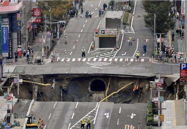 Japonya’nın güneydeki Kyushu adasındaki Fukuoka kentinin ana caddesinde meydana gelen çöküntü beraberinde gas, su ve elektrik hatlarını da beraberinde yuttu.