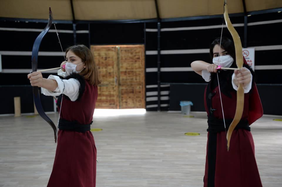 Geleneksel okçuluk çadırında hedeflerine 'ok' atıyorlar