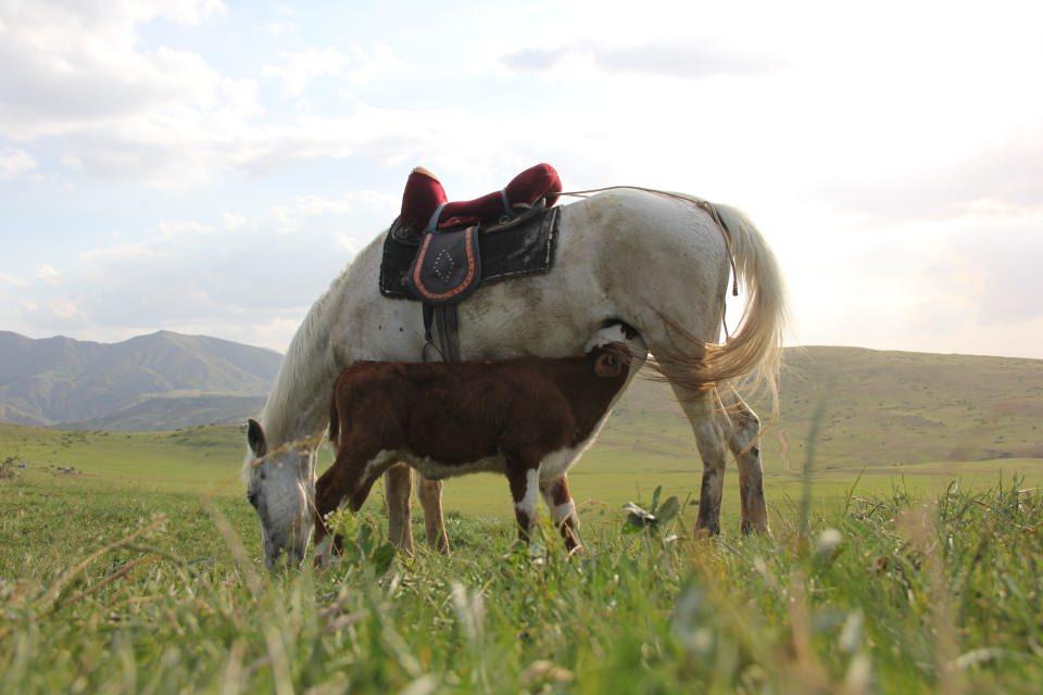 Bir gün baktık, dana atı emiyor. Sabah ve akşam yarımşar saat, hemen hemen her gün danayı emziriyor.