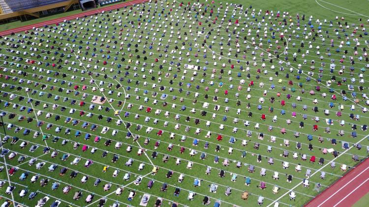 Namaz saati yaklaşırken stadyuma gelen vatandaşlar sosyal mesafe kuralına uyarak saf tuttu. Yüzlerce kişinin katılımı ile kılınan Cuma namazı havadan görüntülendi.