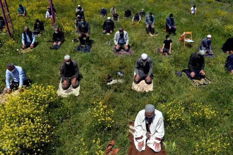 Ardahan'da vatandaşlar, yeni tip koronavirüs (Kovid-19) salgınıyla mücadele tedbirleri kapsamında sosyal mesafe kuralına uyarak açık alanlarda ve çiçekler arasında cuma namazı kıldı.