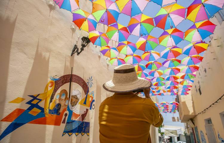 Tunus'taki metruk tarihi sokak şemsiyelerle rengarenk