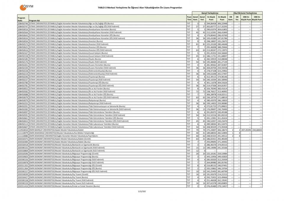 2020 2 yıllık üniversite tavan ve taban puanları 2020