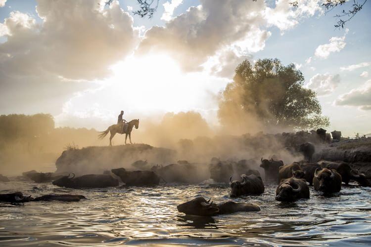 Sürünün kaldırdığı tozun içindeki mandaların, güneşin batışında oluşturduğu görsel şöleni izlemek için özellikle fotoğraf tutkunları mahalleyi mesken tutuyor.