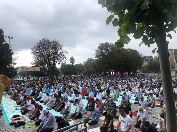 Cami içinin dolmasının ardından cemaat, Ayasofya Meydanı'nda sosyal mesafeyi gözeterek saf tuttu.