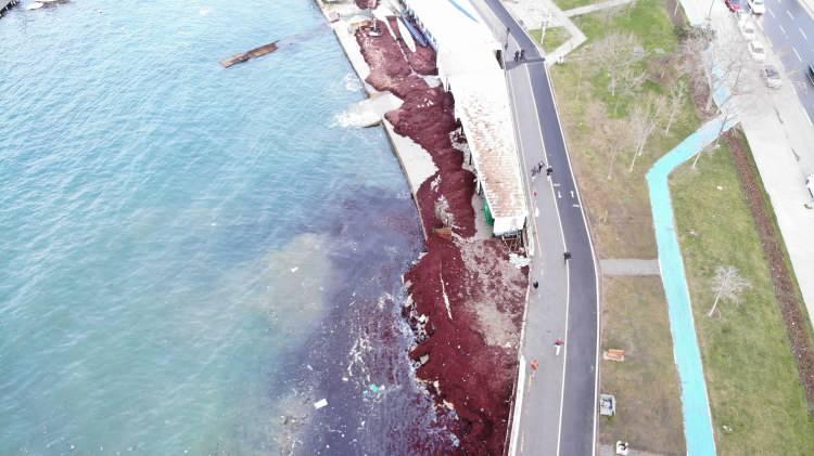 Denizde etkili olan ve kayalıkları döven dalgalar nedeniyle kırmızı yosunlar ile çöpler denizden sahile vurdu.